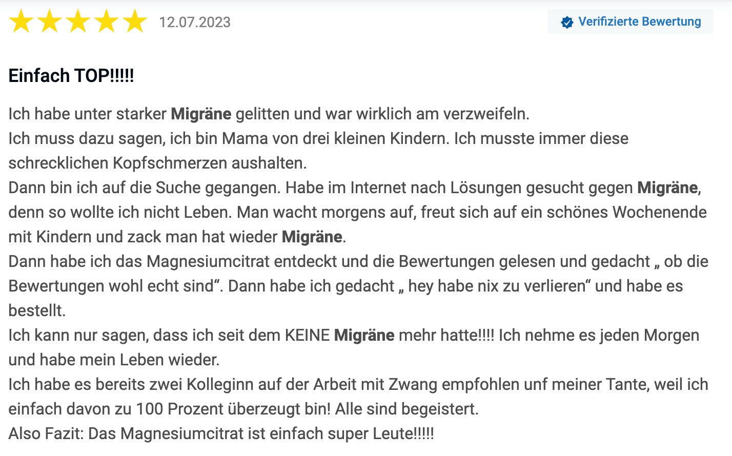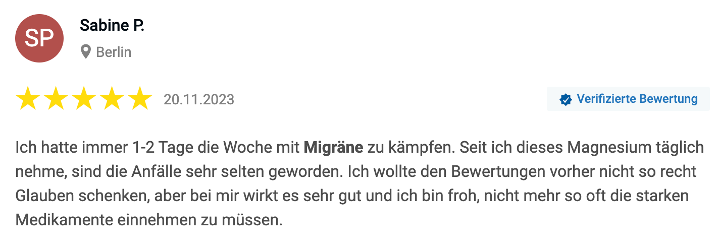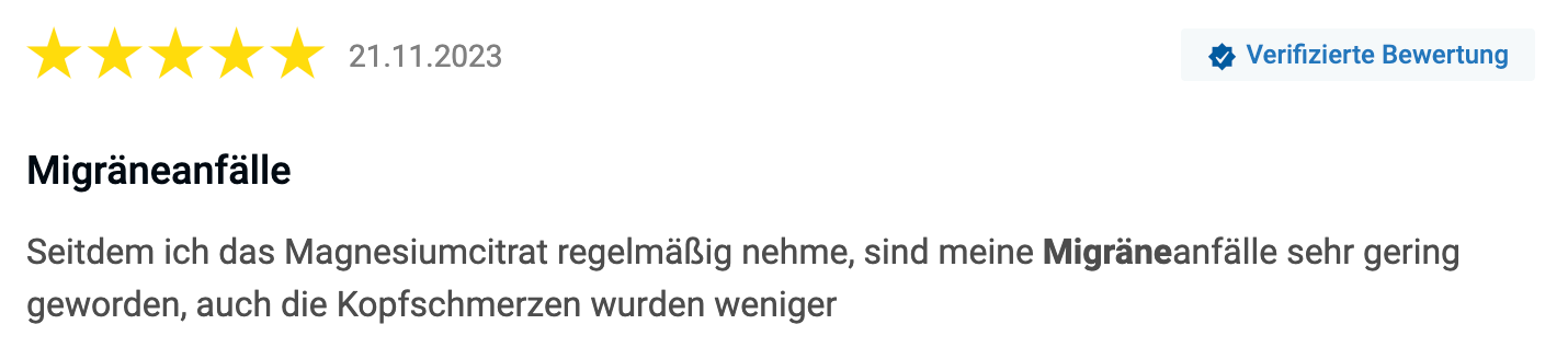 Ob meine Lösung sich für jede:n Betroffene:n anbietet, kann ich nicht sagen. Migräne ist eine ziemlich komplexe Angelegenheit. Ich nehme das Magnesiumcitrat aber mittlerweile seit 8 Monaten und möchte es nicht mehr missen.